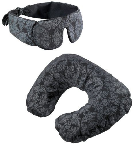 Description : A matching set comprising an inflatable travel pillow and a hand tied eyeshade, complete with draw string pouch. Everything is beautifully finished in a delicately patterned frabic that is distinctly feminine. The soft and silky eye mask is easily adjustable and kind to make up and hair. Fully removable pillow cover makes washing a breeze.
