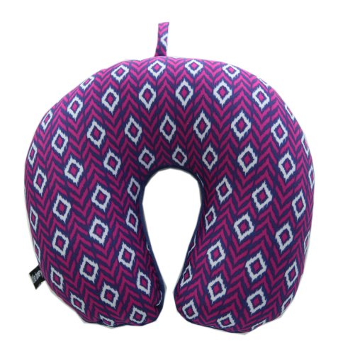 The IKAT pillow is Navy and Purple with an Navy velour backing. Each pillow has a fabric loop that attaches to your luggage or handbag for easy transport.