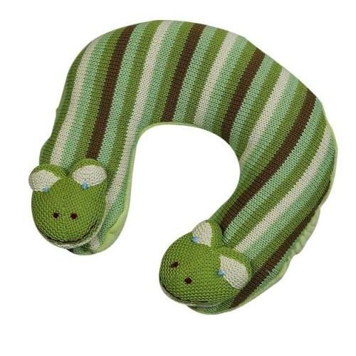 Green and brown striped frog cuddly knit travel pillow with sewn eyes to rest babies little heads on.Features include: