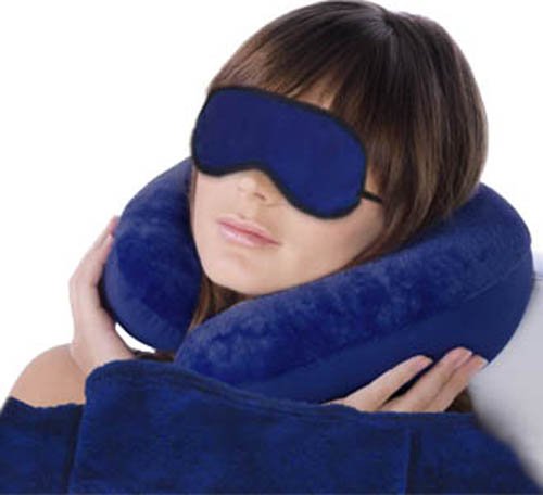 The travel set Making much easier to sleep while traveling, this soft and comfortable travel set has a pillow to cradle your neck, a plush eye mask with elastic band to fit comfortably around your head and a throw blanket to keep you warm.